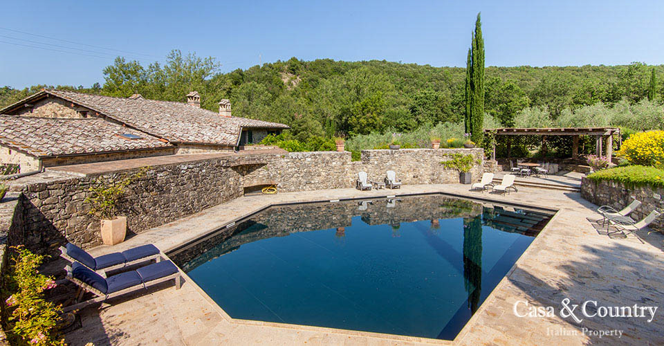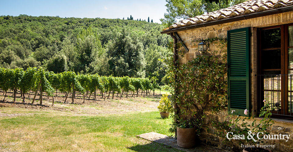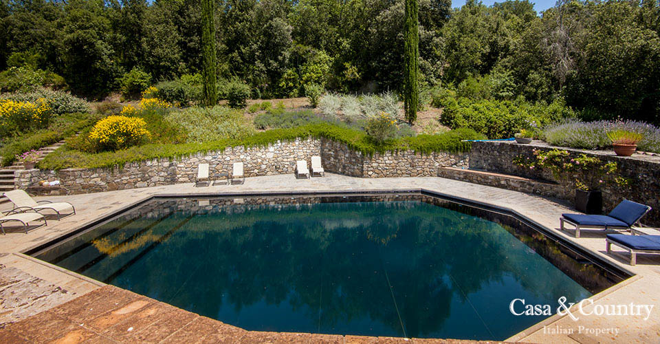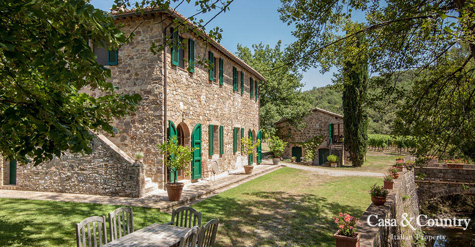 La proprietà comprende 12 ettari che si sviluppano con vigneto di Sauvignon Blanc di 1 ettaro e mezzo, un uliveta con circa 70 alberi, un grande campo “nascosto”, bosco con cascata stagionale, uno stagno e un ruscello denominati Raunate. La piscina posta dietro la casa, si raggiunge tramite una scalinata ed è circondata da un muro in pietra ricostruito ed ampliato rispetto all’originale che formava una gora ed un serbatoio di acqua per il funzionamento di un mulino. L’originale mulino situato tra la casa e la piscina è stato trasformato in “pool house” adibita a spogliatoio.