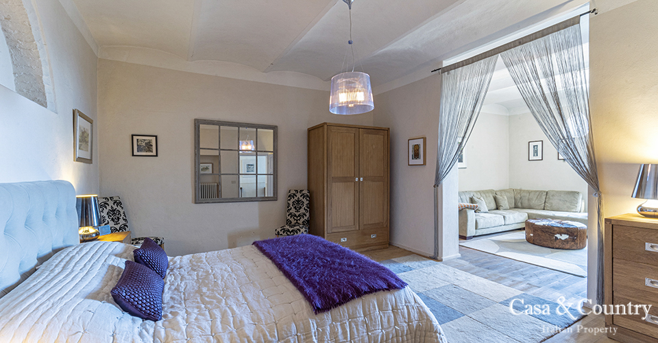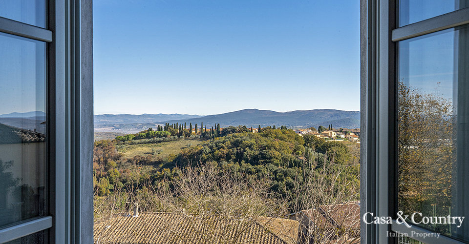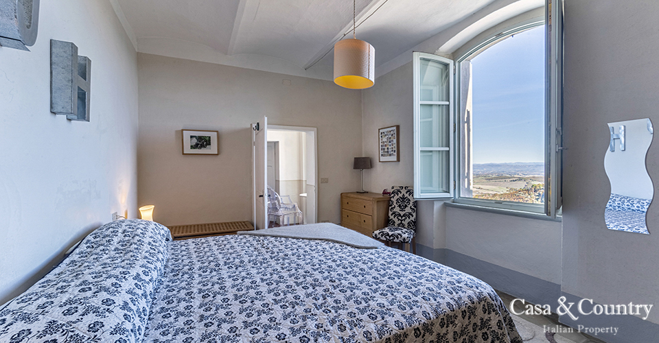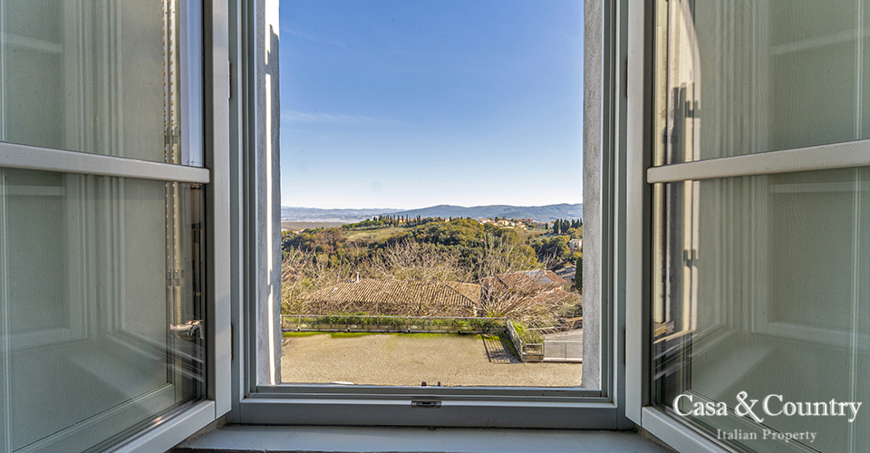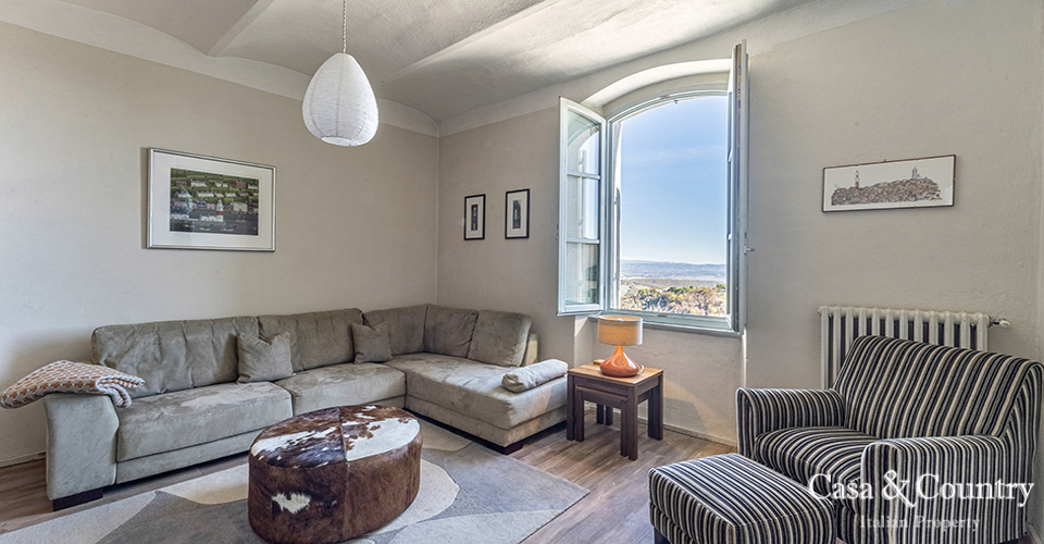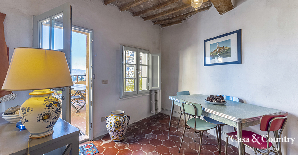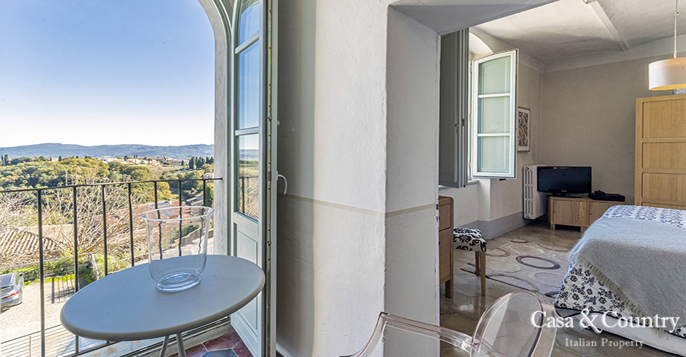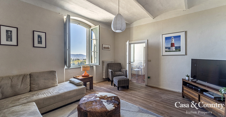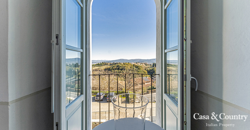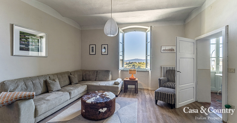 Tuscany Leaning gently against the medieval walls of Casole d’Elsa, this spacious 2-bedroom apartment for sale in Tuscany combines village character with rare light, volume and comfort. Built in the early 20th century as part of the hilltop borgo, the apartment is situated on the noble floor of a classic Italian Palazzo located on the outer walls of the city and considered almost a land-mark by the locals. Perfect as a permanent home, a lock-up-and-leave holiday apartment in Tuscany, or a characterful rental investment, this property offers the rare combination of history, views, outdoor space, garage and true walking-distance-to-amenities convenience in one of the most charming villages of the Val d’Elsa.