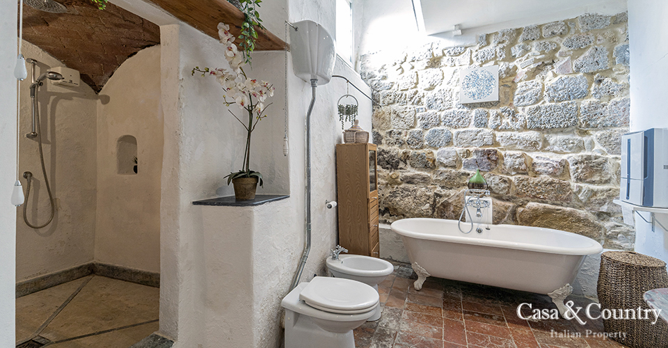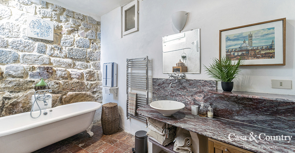 The apartment follows the traditional pattern of interconnected houses, yet stands out for its tall ceilings, generous windows and sweeping panoramic views over the Tuscan countryside. The heart of the property is the bright living area, where large windows frame rolling hills, olive groves and distant farmhouses. From here, a delightful balcony/terrace invites you to step outside with a coffee or evening aperitivo and enjoy the ever-changing colours of the Val d’Elsa. This is classic Tuscan village living, with a view that truly feels “from the top of the world”. The apartment offers two comfortable bedrooms, ideal for a couple, small family or as a holiday home with guest space. The main bathroom is particularly striking: the original stone village walls form a dramatic backdrop to a deep, club-foot bathtub, creating a uniquely atmospheric space that blends history and contemporary comfort.
