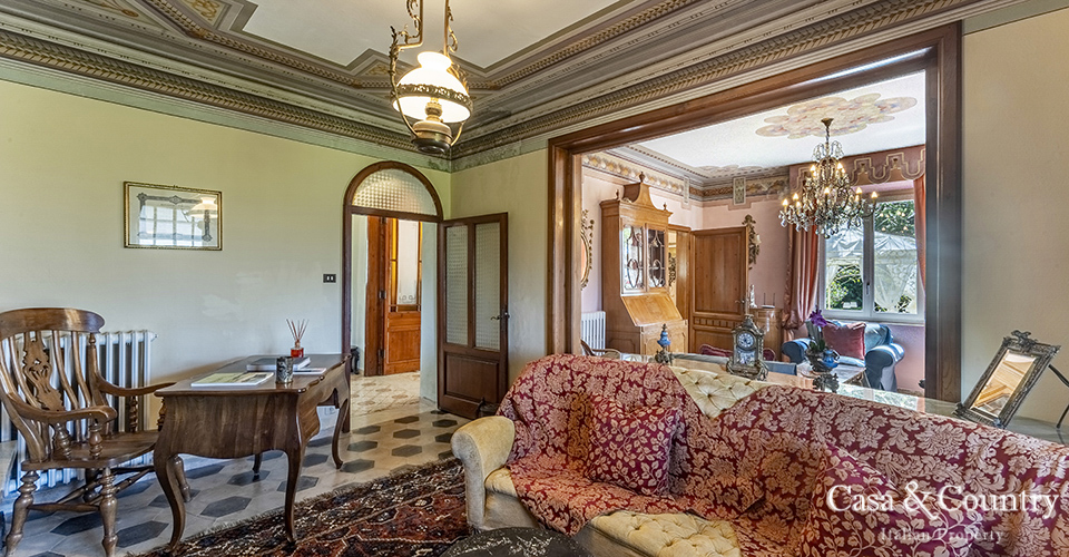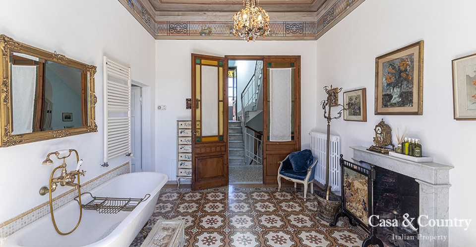 Dating from the early 20th century, the villa reflects the height of Italy’s Liberty movement—a distinctive national interpretation of Art Nouveau that flourished during a cultural renaissance known for its celebration of beauty, innovation, and craftsmanship. Frescoed ceilings, original mosaic flooring, soaring ceilings, and gracious arched windows imbue the interiors with a timeless sense of refinement, evoking the glamour of Italy’s Belle Époque.