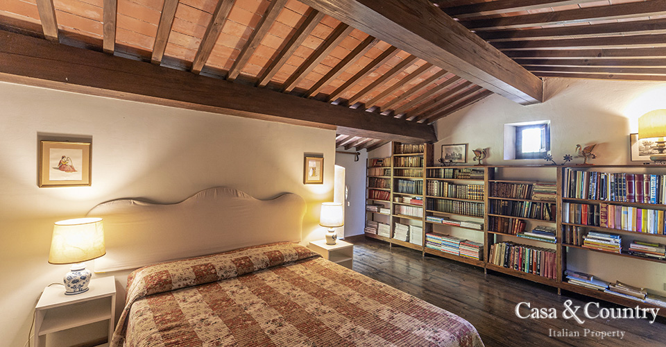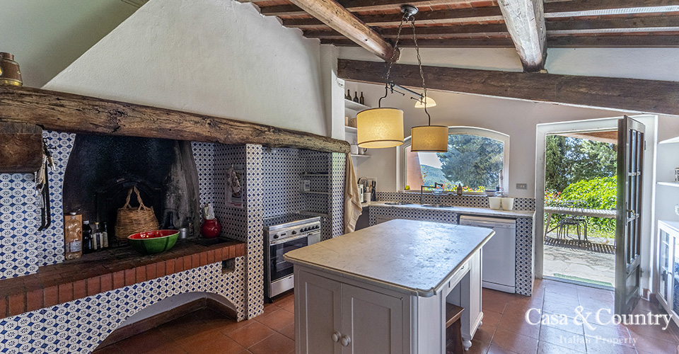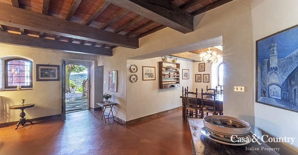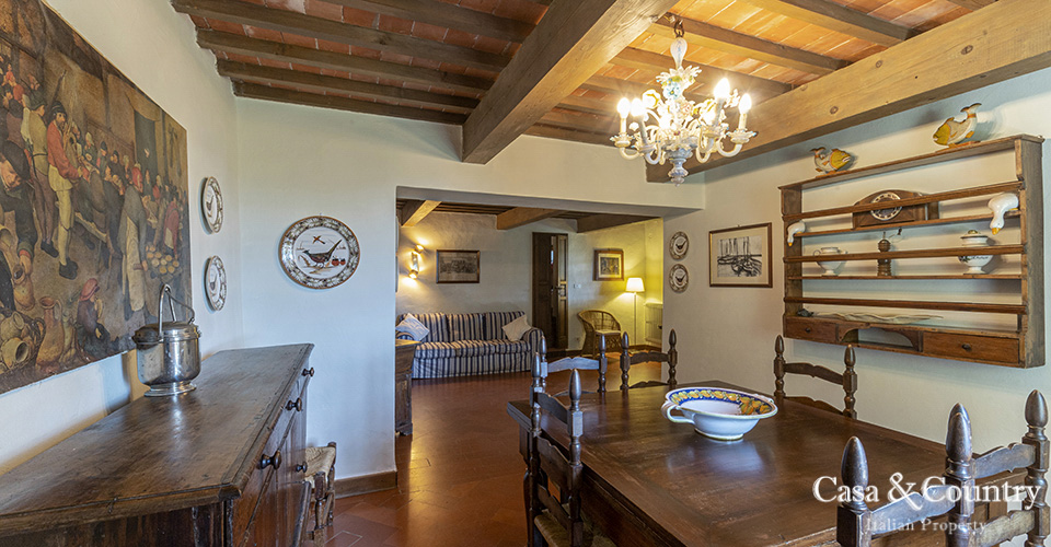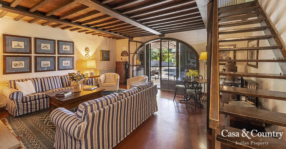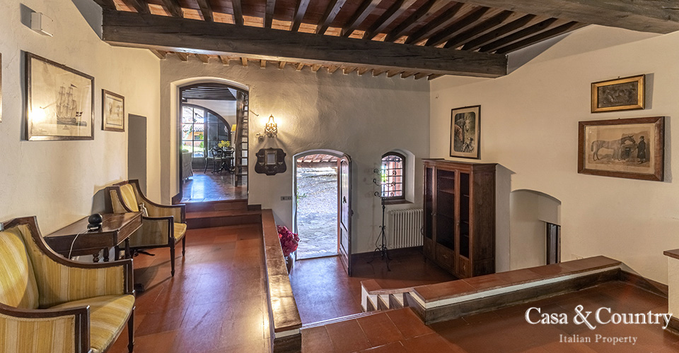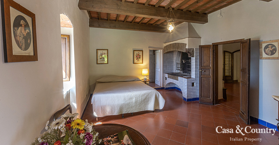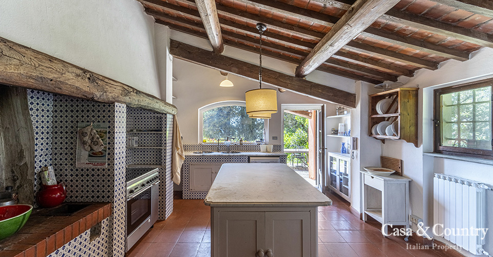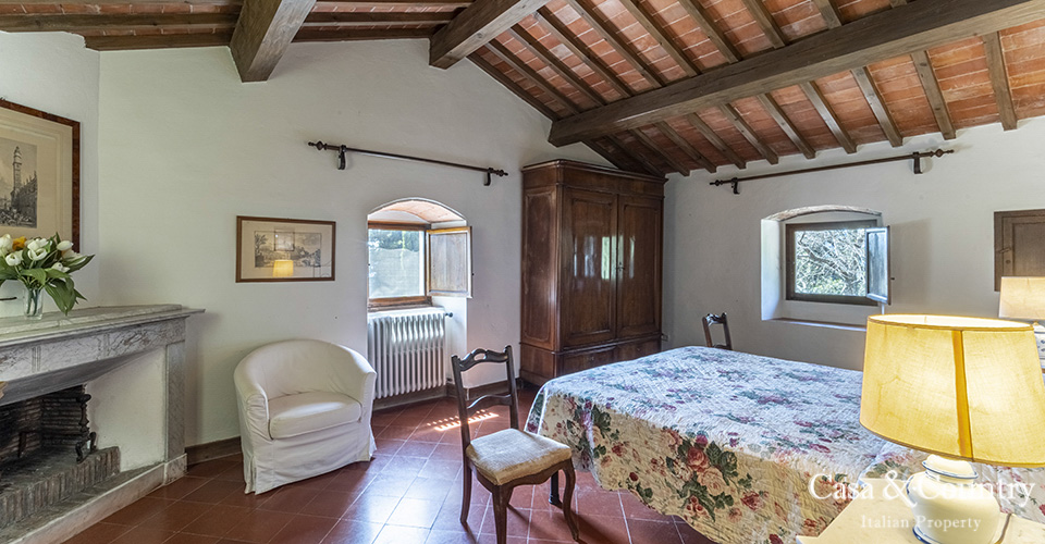 The villa offers 5 spacious bedrooms and 6 bathrooms, with bright living spaces that reflect traditional Tuscan character: terracotta floors, beamed ceilings, and large windows that frame the surrounding greenery. The guesthouse provides further accommodation for family and friends, ensuring comfort and independence.