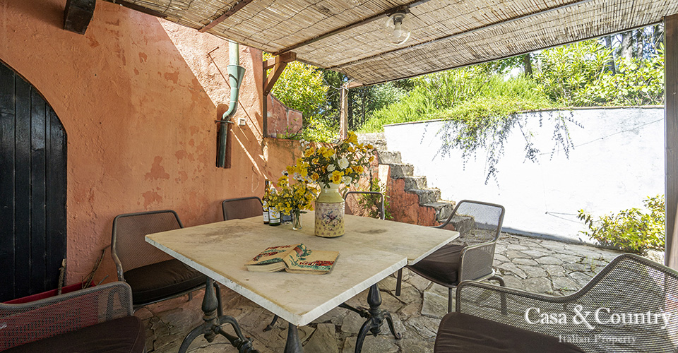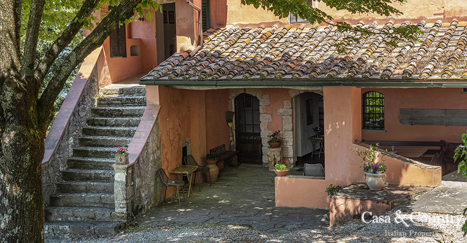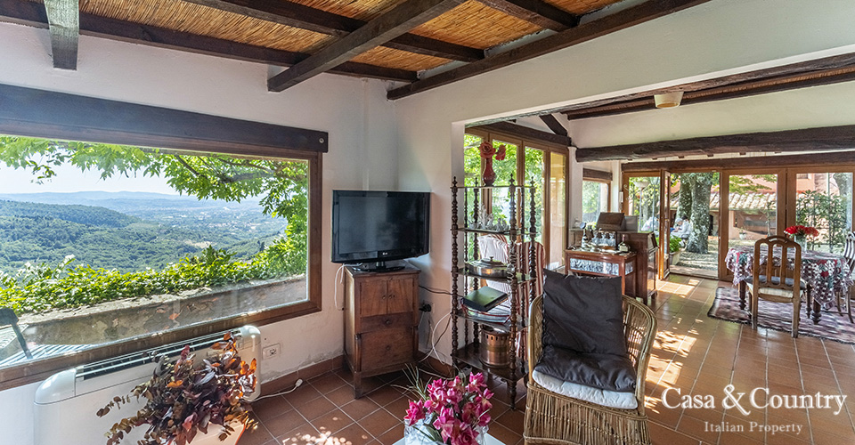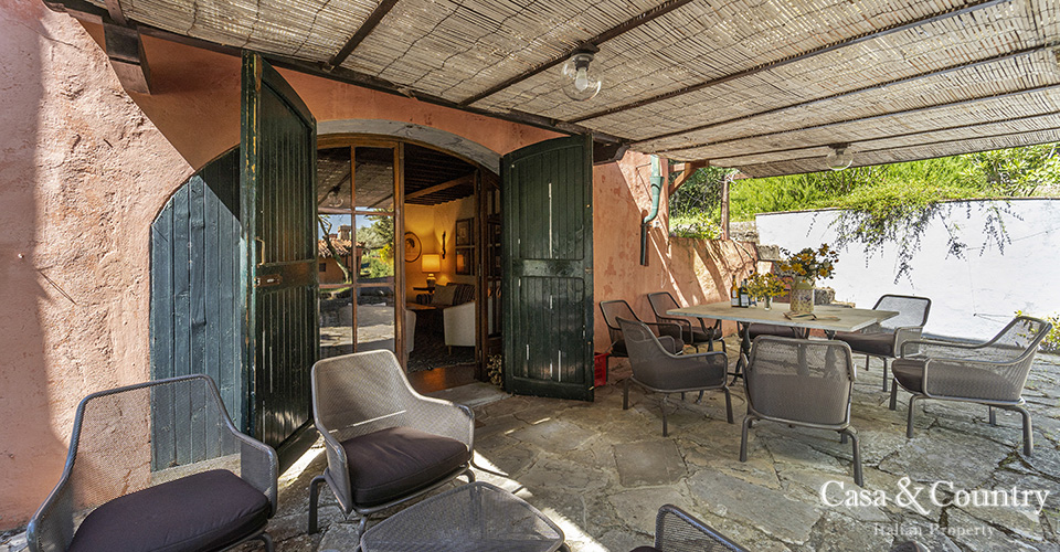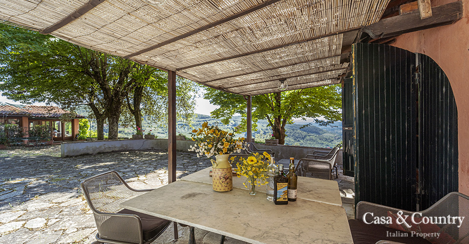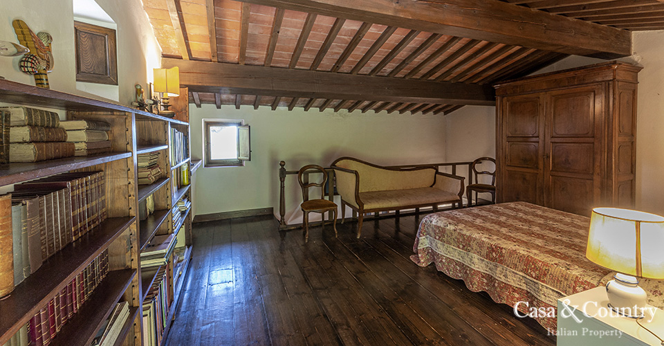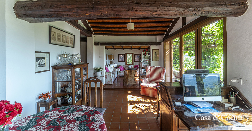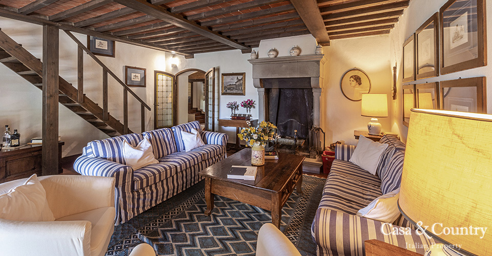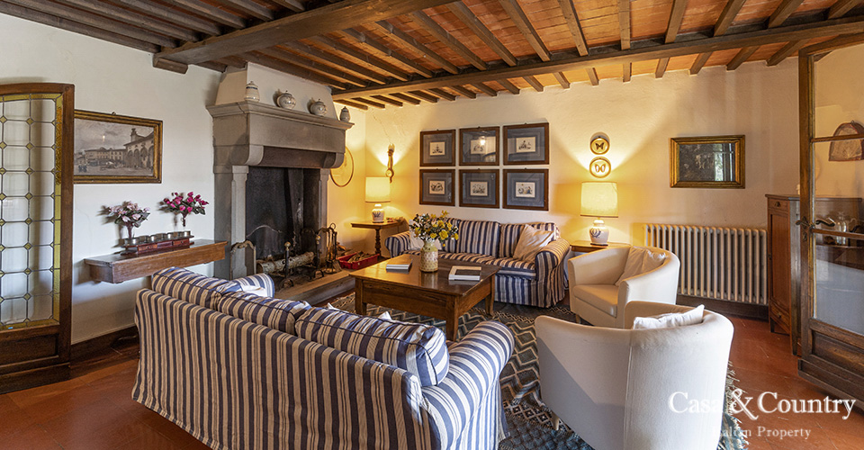 The villa offers 5 spacious bedrooms and 6 bathrooms, with bright living spaces that reflect traditional Tuscan character: terracotta floors, beamed ceilings, and large windows that frame the surrounding greenery. The guesthouse provides further accommodation for family and friends, ensuring comfort and independence.